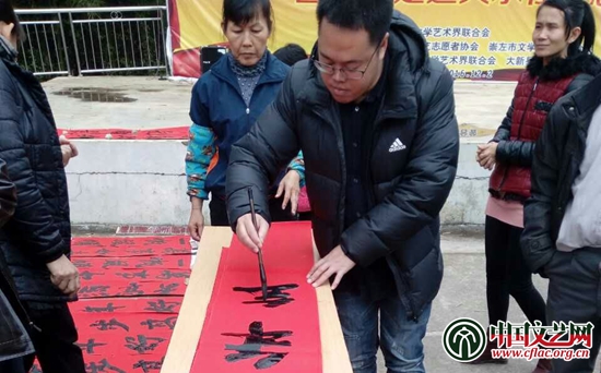 另一边,来自广西书法家协会的书法家们摆开书案、摊开红纸挥毫泼墨,为村民们免费写春联、写“福”字。一副副笔法娴熟的红春联和精美大方的“福”字,深受当地农民的喜爱。而墨汁尚未干透的春联、福字,平铺在周围的地面上,通红的色彩洋溢着浓郁的喜庆氛围。
