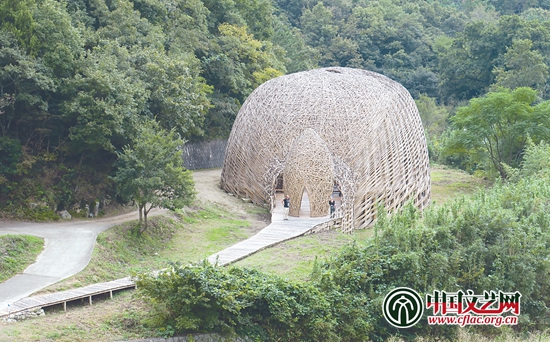 造型艺术家们在山间小道上用竹坯创作的艺术品