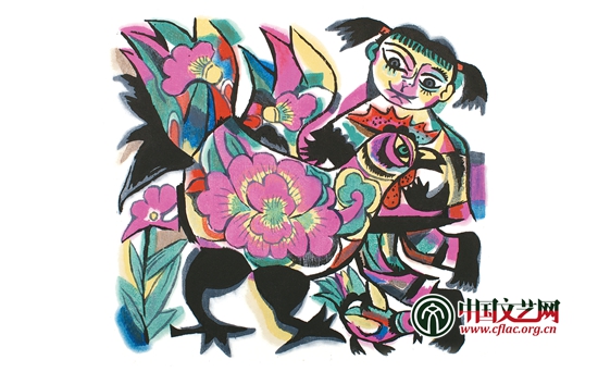 我在欣赏、研究、分析民间木版画特点的同时,看到了民间木版画在艺术形式上的独到之处,比如:淡化物体光影,以三维空间的塑造,在对待不同题材的灵活处理中,产生奇妙别致的构图——人、动物采用夸张其典型特征而舍弃一般特征的方法,以增强造型上的力度,民间画诀中有“将无项,女无肩”“文人一根钉,武人一张弓”“十斤狮子九斤头,一斤尾巴掉后头”等非常大胆的造型处理;在对形体的高度提炼和概括中,线的强弱、主次、疏密、虚实的组合,以及利用红绿、黄紫、橙蓝、黑白的色彩对比,“硬碰硬”的色彩搭配方法,显得艳而不媚,耀而不俗,这些是先辈们在木版画方面的辉煌成就和贡献。但是我也注意到当时木版画在复制时受到各种材料工艺的限制所采用的“陡刀立线”刻制版画的局限性,以及在色彩造型处理方面的程式化而显得画面单调的缺憾,这正是学习民间木版画时应该认识到的地方,这样在创作中才能扬长避短,将传统文化的精华融合到自己的艺术创造中。