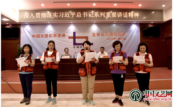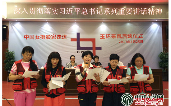 5月25日,中国女摄影家“不忘初心、继续前进”主题党日活动暨中国女摄影家走进玉环摄影采风活动启动仪式在浙江省玉环市举行。图为河南省周口市女摄影家协会主席马宝兰等5人诵读《中原的麦地》。应华媚 摄