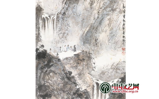 如本次展出的傅抱石的画作《观瀑图》构图满密,瀑布飞泉依山势而下,画家用深浅不同的墨色营造出深远的空间感、真实感。立于石台之上的七人,沉浸在瑰丽多彩的山色与震耳欲聋的水声中,畅然忘返,头戴东坡巾的一人,将一幕具有视觉感的山川瀑布自然景观变成了文化胜景。对于山水画,郭熙在《林泉高致》中说:“山水,大物也。人之看者,须远而观之,方见得一障山川之形势气象”,荆浩说要“图真”,石涛说“搜尽奇峰打草稿”——傅抱石在传统技法基础上,推陈出新,独树一帜,对瀑布的描绘自然流畅,粗犷中不失法度,工巧精致中凸现神采,影响后世。郭沫若曾评价:“抱石作画别具风格,人物善能传神,山水独开生面。盖于旧法基础之上摄取新法,而能脱出窠臼,体现自然。”