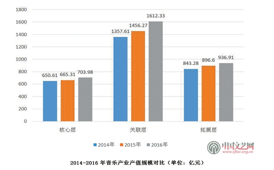 从总体规模分析来看,2016年音乐产业核心层产值规模为703.98亿元,所占比重21.64%,同比有所下降,以音乐创意为主的核心层行业正处于新旧动能转换的关键节点,传统实体音像业进一步下滑,数字音乐产业因人口红利逐步消退、用户增量变缓而逐步进入存量用户的深耕时代;但音乐现场演出的崛起、数字音乐付费用户的快速增长以及商业模式的创新,都将推动核心层产业进入快速增长的轨道。