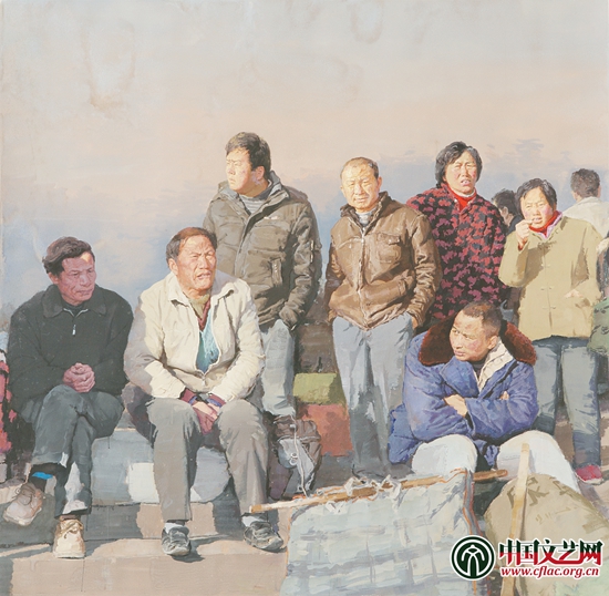 阳光下的农民工,眺望着远方,守候着最真实质朴的希望。熟褐与朱红的脸庞、白色的衬衣、大红色的棒球帽构成了画面的纯色与亮色,与土黄伴着赭石的灼热土地、冷灰与暖灰交叠的天空以及远处米灰色的城市建筑群呼应协调,最大限度地提高了画面整体的色彩饱和度,利用热色光效,让现场的真实与素朴最大限度地呈现出来。同时,他在笔法上,大刀阔斧,用笔意写,和画面塑造的农民工形象内外统一,通过简单明快的绘画艺术语言凸显出农民工身上纯朴自然的艺术美感。