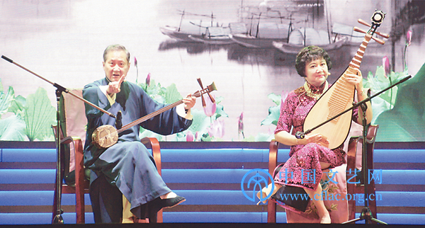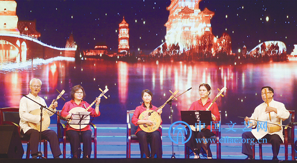 来自中国台湾的叶文生、简顺亮、陈素珍、吴素卿、蔡佩臻表演月琴念歌《赏花灯》