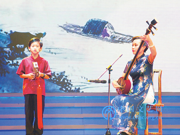 来自中国台湾的小朋友庄闳皓与来自大陆的老师郑力文共同表演《风雨归舟》