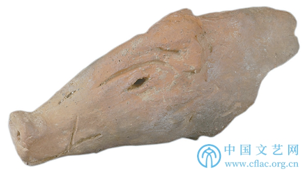 这件红陶猪头出土于平谷区上宅遗址。上宅遗址属于北京地区新石器时代文化遗存,是北京地区迄今发现最早的原始农业萌芽状态的新石器时代文化。仿生陶猪的獠牙已经很小,吻部也变短,更多的表现出家猪的特点。猪形陶器的发现反映出原始定居农业和畜牧业的发生。