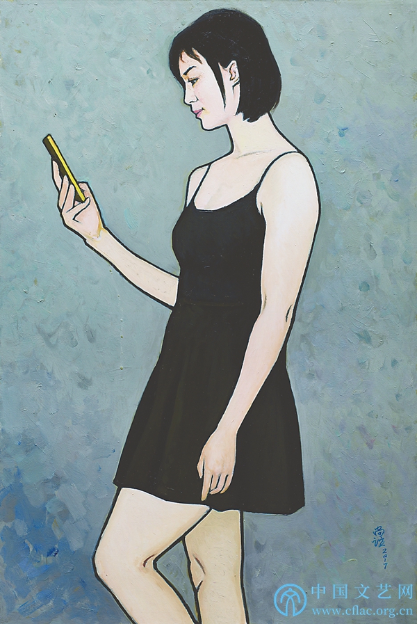 “过去,我对这个社会是熟悉的,技术问题解决之后,创作就应运而生。现在我不了解这个社会了,因为中国发展得太快。虽然如此,我仍然在努力追求,作为画家我能够不断地探索,不服老地继续画,因为我感受到研究的乐趣。”靳尚谊从未停下自己的脚步。在绘画语言风格上,他不再像过去那样强调对人物形象体积结构的塑造,而更注重对人物轮廓线的刻画,形成既平面又具有强烈色彩的画面。它变得更单纯,仿佛回到了欧洲文艺复兴早期的风格。