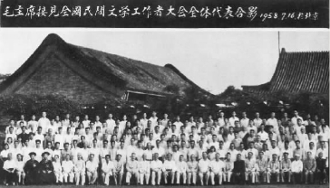 1959年2月22日,中国民研会、中国作家协会联合召开了由老舍主持的有新疆、内蒙古、青海、云南等省、自治区代表出席的民族民间文学座谈会。会议讨论了“三选一史”问题(三选即歌谣选、故事选、谚语选,一史即文学史),为后续工作未雨绸缪。之后,中国民研会又陆续组织出席全国文教群英会的民间诗人及民间歌手座谈会等活动,郭沫若、周扬、阳翰笙、唐弢、毛星、贾芝等参加了民间诗歌交流,并在民歌创作实践、采风活动中贡献良多。新中国文艺家及民间故事家、民间歌手及其他门类的民间文艺家们,彼此唱和,激情澎湃,不断坚定与强化推动民间文艺调查研究向广阔和纵深发展的信心和力量。