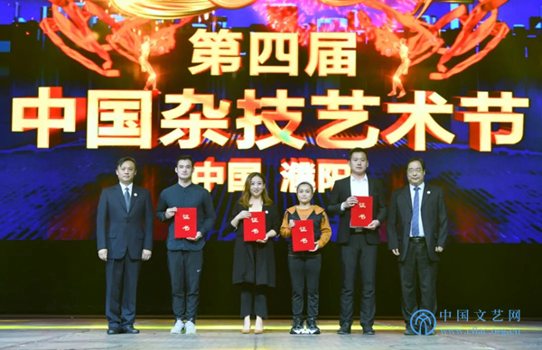9月26日,第四届中国杂技艺术节闭幕式在河南濮阳水秀国际大剧院举行。图为向上海杂技团《时空之旅》等4台剧目颁发分会场优秀剧目展演纪念证书。
