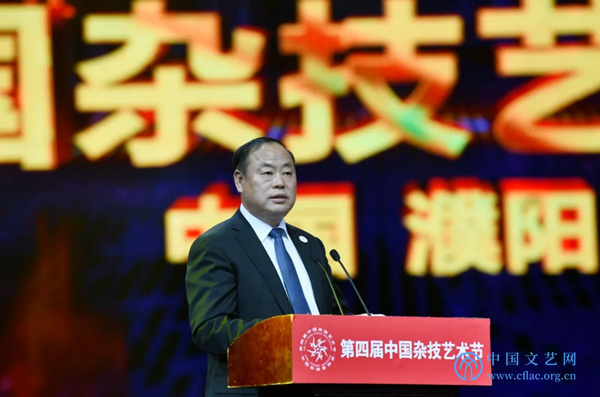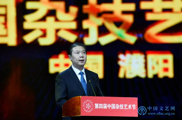 9月26日,第四届中国杂技艺术节闭幕式在河南濮阳水秀国际大剧院举行。图为中共濮阳市委书记宋殿宇致辞。