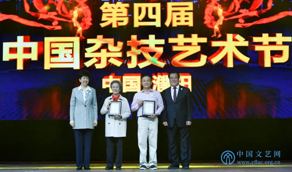 9月26日,第四届中国杂技艺术节闭幕式在河南濮阳水秀国际大剧院举行。图为中国文联副主席赵实,中国文联副主席、中国杂技家协会主席边发吉向中国杂技团王桂琴、上海杂技团蒋正平颁发“中国文联终身成就杂技艺术家”奖牌。