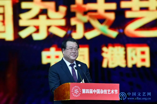 9月26日,第四届中国杂技艺术节闭幕式在河南濮阳水秀国际大剧院举行。图为中国文联副主席、中国杂技家协会主席边发吉致辞。