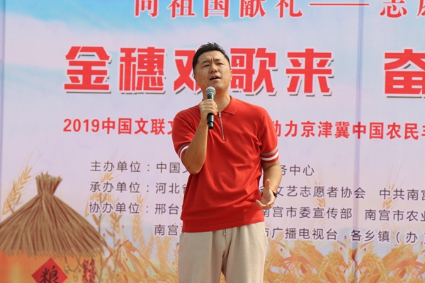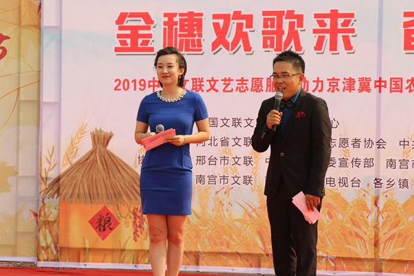 9月27日,庆祝中华人民共和国成立70周年“金穗欢歌来 奋进新时代”——2019中国文联文艺志愿服务助力京津冀中国农民丰收节主题活动在河北省南宫市举办。图为郝若彤、张义明主持本次演出。中国文艺网 苏锐 摄