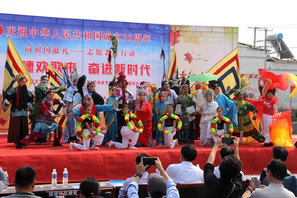 9月27日,庆祝中华人民共和国成立70周年“金穗欢歌来 奋进新时代”——2019中国文联文艺志愿服务助力京津冀中国农民丰收节主题活动在河北省南宫市举办。图为南宫市荣春京剧团演唱京歌《大写尚小云》。中国文艺网 苏锐 摄