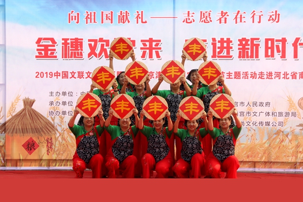 9月27日,庆祝中华人民共和国成立70周年“金穗欢歌来 奋进新时代”——2019中国文联文艺志愿服务助力京津冀中国农民丰收节主题活动在河北省南宫市举办。图为开场舞《丰收广场舞》。中国文艺网 苏锐 摄