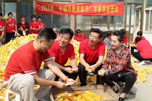 9月27日,2019年“中国农民丰收节”农事体验活动。图为艺术家与当地农民一起体验搓玉米粒。中国文艺网 苏锐 摄