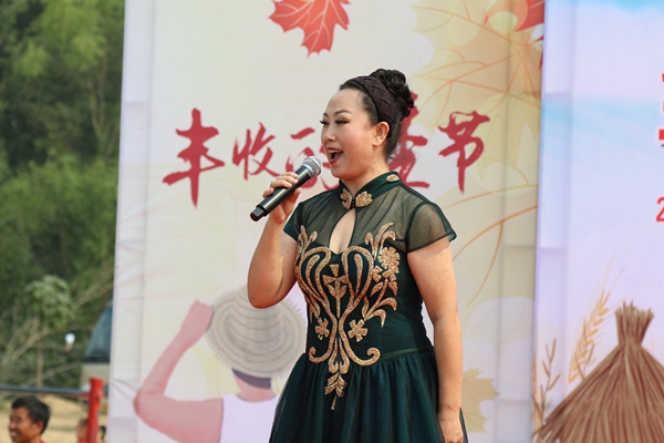 9月27日,庆祝中华人民共和国成立70周年“金穗欢歌来 奋进新时代”——2019中国文联文艺志愿服务助力京津冀中国农民丰收节主题活动在河北省南宫市举办。图为曲丹演唱《在希望的田野上》。中国文艺网 苏锐 摄