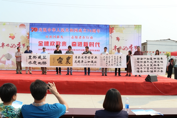 9月27日,由中国文联文艺志愿服务中心主办、河北省文联承办、南宫市文联等单位协办的庆祝中华人民共和国成立70周年“金穗欢歌来 奋进新时代”——2019中国文联文艺志愿服务助力京津冀中国农民丰收节主题活动在河北省南宫市举办。中国文艺志愿者协会副主席刘全利,中国文联文艺志愿服务中心群众文艺处负责人蒲强,河北省文联副主席张海英,河北省文联组联处处长、河北省文艺志愿者协会秘书长张占芳、河北省文联机关党委专职副书记常黎青、南宫市委、市政府、市文联等领导以及中国书法家协会理事、河北省书法家协会副主席郎岗峰等书画艺术家出席活动。