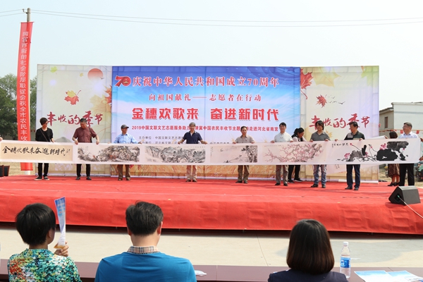 9月27日,庆祝中华人民共和国成立70周年“金穗欢歌来 奋进新时代”——2019中国文联文艺志愿服务助力京津冀中国农民丰收节主题活动在河北省南宫市举办。图为美术作品捐赠。中国文艺网 苏锐 摄
