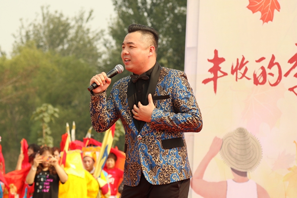 9月27日,庆祝中华人民共和国成立70周年“金穗欢歌来 奋进新时代”——2019中国文联文艺志愿服务助力京津冀中国农民丰收节主题活动在河北省南宫市举办。图为李浩演唱《大中国》《兄弟干杯》。中国文艺网 苏锐 摄