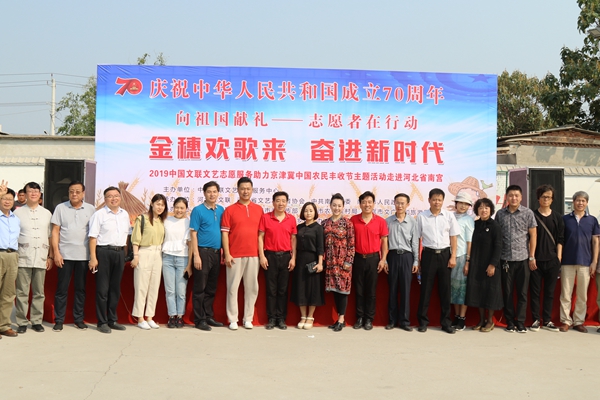 9月27日,庆祝中华人民共和国成立70周年“金穗欢歌来 奋进新时代”——2019中国文联文艺志愿服务助力京津冀中国农民丰收节主题活动在河北省南宫市举办。图为合影留念。中国文艺网 苏锐 摄