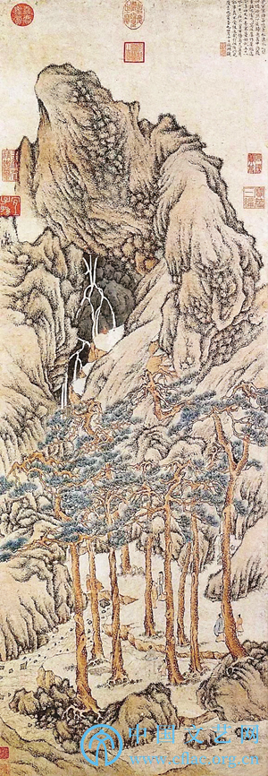 要论起文徵明的归隐情怀,还要从他辞官返乡后开始创作《松壑飞泉图》开始。《松壑飞泉图》历时5年创作,呈现出的是文徵明晚年绘画的“繁密深秀”。从构图可分为上下两部分,繁密的山石堆叠于上部,几株苍劲的松树排列于下部,二者之间被几道细细的山涧泉水连接。比较有趣的是树下的人物活动:几位文人相聚松间,有的临溪独坐做思考状;有的在交谈;有的似姗姗来迟,在侍者的陪伴下打着招呼;空空的桌案旁站立一人,似刚结束了一场雅集;在半山腰处,还有一位认真观泉的高士。高耸的山峦,象征着士人的节操;下半部分,则是文徵明向往的文人生活。当文徵明和一群江南文人掌握了文化话语权之后,当时的艺术圈呈现出另一派新气象。从《松壑飞泉图》起,文徵明开始以隐士心态全身心投入艺术创作。