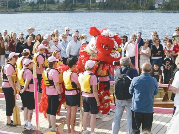 2008年9月14日,在纽芬兰东部,离首府圣约翰斯不远的天堂镇的八角湖,正在举行一场别开生面的龙舟点睛和下水仪式。这条龙舟的出资人是当时纽芬兰生意最红火的中餐馆“苏记食家”的所有者、来自香港的苏金堂先生和谭杏媚女士。苏先生和谭女士对于中华文化十分推崇,其中,苏先生本人还是一位出色的舞狮表演者。而龙舟的使用者则是一群英裔或爱尔兰裔的乳腺癌幸存者。在一次募捐活动中,纽芬兰乳腺癌幸存者协会请求苏先生和谭女士的帮助,于是,苏先生建议:“在圣约翰斯,每年八月的第一个星期三都会有赛舟会。这与我们中国传统的端午节赛龙舟很相似。既然你们要表现康复之后的激情与活力,为什么我们不组织一个龙舟队呢? ”于是,在苏氏的资金支持和文化建议下,阿瓦隆龙舟队(The Avalon Dragons)成立,并开始积极参与到纽芬兰的各类赛舟赛事和募捐活动中。与其它竞技队伍使用的船只不同,阿瓦隆龙舟队所采用的是中国传统式样的龙舟,样式简单古朴,色彩绚烂缤纷。然而,苏金堂先生并不满足于单纯地引入传统龙舟的外在形式,他更希望传递和传承龙舟所蕴藏的文化含义和精神气质。这便是9月14日龙舟点睛入水仪式的由来。在仪式上,苏先生亲自为龙舟点睛,并解释了仪式的历史基础和信仰内涵。同时,在仪式过程中还加入了中国文化的其它元素,如同样以祛病禳灾和强身健体为主题的舞狮和太极拳表演,使得仪式过程成为了中华文化对外传播的集中展演。