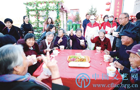 盐池县民俗文化艺术节重阳寿辰庆典仪式上,老人们围桌而坐,欢庆节日。
