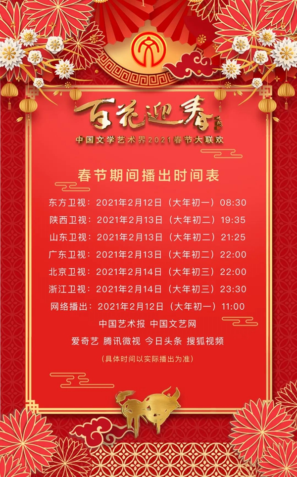 农历辛丑年大年初一起, 2021年“百花迎春”相继在东方卫视、陕西卫视、山东卫视、广东卫视、北京卫视、浙江卫视以及中国艺术报、中国文艺网、爱奇艺、腾讯微视、今日头条、搜狐视频与我们如约见面,让我们一起期待这场云端“文艺界大团圆”吧!