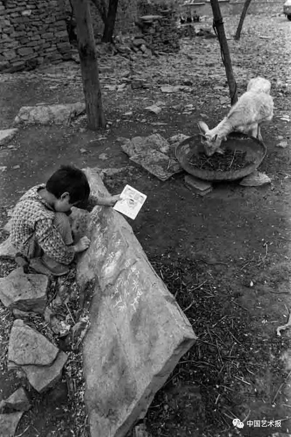 1991年5月,山东省沂南县黄山坡乡,一边放羊一边写字的小女孩