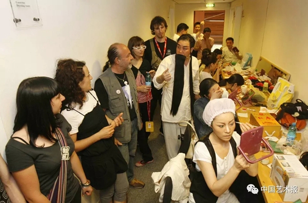 李树建赴法国演出时,在化妆间给国际友人讲解中国戏曲知识
