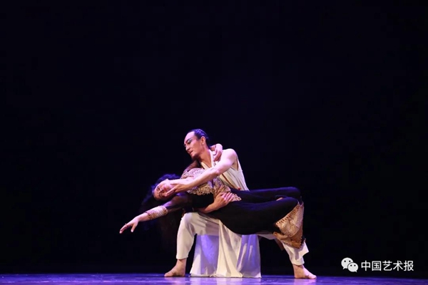 ●中国艺术报:印度的舞蹈艺术和我们国家有很大差别,合作一定遇到了困难和挑战。 ◎滕爱民:困难的确挺多的。我一开始以为,他们派过来的会是具有现代舞训练基础的舞蹈演员,能唱会跳,自由又奔放,后来才知道,派过来的都是传统印度舞演员。她们的舞蹈语汇和印度佛教文化的联系非常紧密,演员们的每一个动作都包涵着自己的信仰,不能随意更改。比如说,她们在表演的时候,只需要一平方米的空间就可以,但舞台那么大,一个演员从头到尾只在一个地方跳,那算怎么回事?再比如,她们的舞蹈节奏比较慢,动作都是固定的,也是成套的,对于完整性的要求很高,但一部舞剧的时间毕竟有限,只能选取一部分,删掉一部分。我和她们沟通的结果是,不能拆分,绝对不能,怎么说都不行,因此编创的过程中几乎每天都在“吵架”。后来我换位思考,如果别人随意改变肢解我们的传统文化,我们一定也不会允许,一定也会坚守到底。于是我以充分理解他们的文化为基础,真诚和他们沟通交流,努力多角度尝试,才找到解决办法,通过舞台调度的方式,在不破坏其节奏和完整性的情况下,将其融合到整部作品当中。