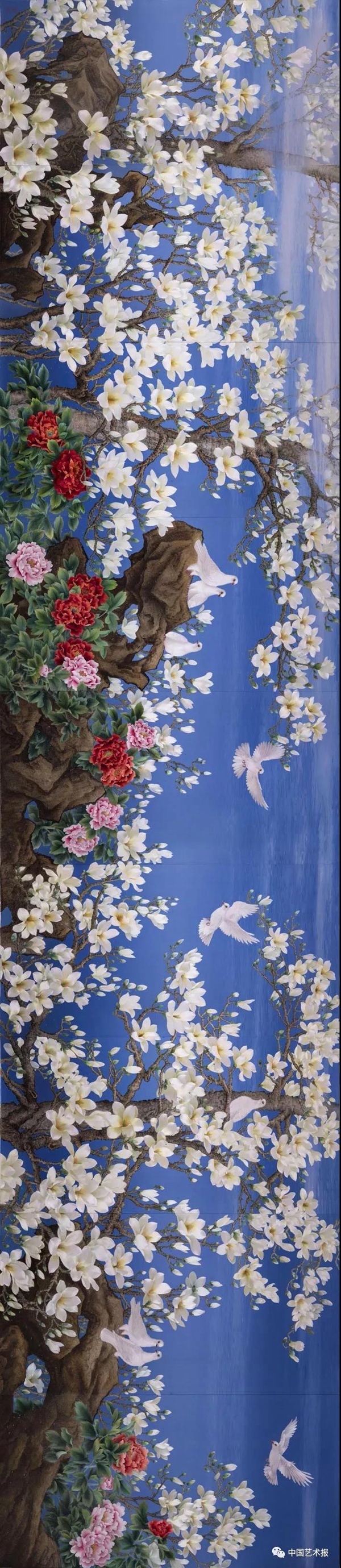从2000年开始,我们绣了《世纪和平——百鸽图》,表达世界和平的主题;后来绣了《我爱中华》,表达五十六个民族大团结的主题;再到2008年,我和朱龙泉老师一起向奥运会献礼,绣了《和谐——百年奥运中华圆梦》;2013年,习近平总书记提出“一带一路”倡议,我带领团队花三年时间创作了《丝绸之路》系列(《西出长安》和《满载而归》,其中《满载而归》已被中国美术馆收藏);2018年为首届上海进博会主会场迎宾厅创作苏绣《玉兰飘香》……这些都是有时代性的。