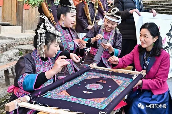●中国艺术报:您曾经提到绣花针扶贫的概念,前不久,还到广西三江、内蒙古鄂尔多斯帮扶当地绣娘,作为中国文艺志愿者协会的副主席,请您谈谈这方面的工作。