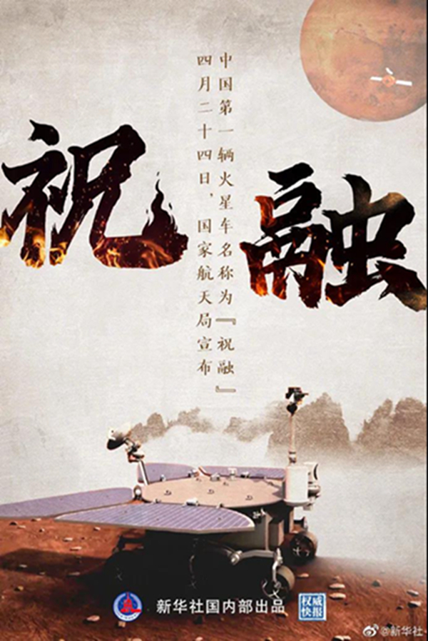 4月24日,我国首辆火星车名称揭晓,经全球征名、专家评审、网络投票等层层遴选,最终“祝融号”脱颖而出。祝融是中国上古神话中的火神,三皇五帝时掌火之官。首辆火星车命名来自中国传统文化元素,与我国其他航天器命名思路一脉相承,例如:“嫦娥”“墨子”“悟空”“北斗”等。以火神的名字命名中国第一辆火星车,是现代科学与传统文化的跨时空融合,体现着航天人的科学梦想和浪漫情怀,彰显着中国人的探索精神和文化自信。