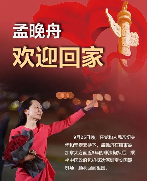 9月25日晚,在党和人民亲切关怀和坚定支持下,孟晚舟在结束被加拿大方面近3年的非法拘押后,乘坐中国政府包机抵达深圳宝安国际机场,顺利回到祖国。
