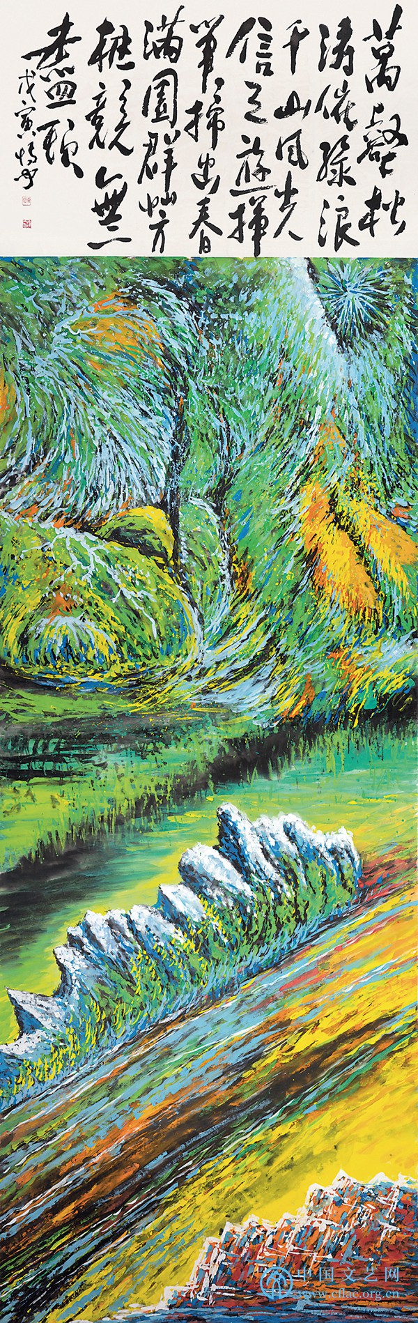 孙博文的彩墨山水画是对外物的感受与心性素养的释放,画中有他通过洞察宇宙自然和社会人情后,用心架构的物象,用情诉说心境,一笔一画均迸发着强烈的感染力,画面的诗文又直入观者的内心世界引发情感共鸣,真情流露正是绘画最重要的精神内涵。画面情感奔放,思维自由,笔触放逸,为一种缘于传统的“和合”理念所统摄,这个统摄力协调了画面中贯通古今中外的语言与符号,让线条、墨色、光影、空间和观念符号丰富又充满秩序感,也协调了对生命的思考与内心世界的感悟,实现主客观世界的和谐统一,失去这种统摄力,再丰富多彩的艺术形式也会丧失意味和天趣而沦为乱序。