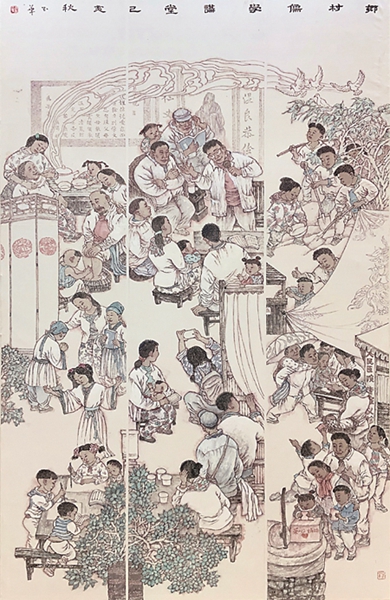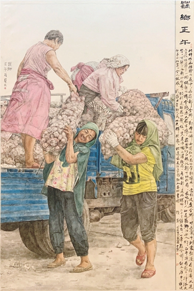 另外,本次活动展出的中国画作品《乡村儒学讲堂》《枣之韵》《黄河岸边玉米香》《梨乡春雪》《泰山脊梁》《海草房记忆》《渔归》《花石村新气象》《金山银山沂蒙山》《轻轨驶入百姓家》《风雪显精神》《山里红》《周村古商城》《文昌阁》《红袖章》《火红盛世》《龙口粉丝驰名中外》《月华家山静无风》《富民渔歌》《丹心一片向阳开》……以及版画《大蒜之乡》、农民画《菜乡之梦》《山乡巨变》、瓷板画《蹴鞠图》《蒲松龄故居》《文姜观盛世》、油画《造船厂》《蒙山上的苹果熟了》《金银花开了》《费县奇石》《日照非遗——推小虾》等作品,分别从不同角度和运用不同笔墨语言诠释了“寻找美术符号助力乡村振兴”活动的美学和文化价值。