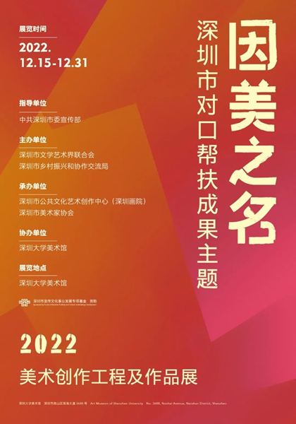 党的二十大报告指出新时代十年我们经历了对党和人民事业具有重大现实意义和深远历史意义的“三件大事”,其中之一即为“完成脱贫攻坚,全面建成小康社会的历史任务,完成实现第一个百年奋斗目标”。“文章合为时而著,歌诗合为事而作”,在全国上下深入学习贯彻党的二十大精神之际,在中共深圳市委宣传部的指导下,深圳市文学艺术界联合会与深圳市乡村振兴和协作交流局联合主办、深圳市公共文化艺术创作中心(深圳画院)、深圳市美术家协会承办“因美之名——深圳市对口帮扶成果主题美术创作工程及作品展”,用文艺作品去表现、铭记此意义非凡,影响深远的历史时刻、历史事件。
