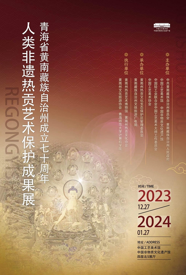 为大力弘扬中华优秀传统文化,扎实做好非物质文化遗产的系统性保护,进一步坚定文化自信自强,不断深化文化交流宣传,12月27日,由黄南藏族自治州委员会、黄南藏族自治州人民政府、中国工艺美术馆 中国非物质文化遗产馆、中国轻工业联合会中国工艺美术大师工作委员会、中国工艺美术协会主办,黄南州热贡文化生态保护区管理委员会、黄南藏族自治州文体旅游广电局承办的“青海省黄南藏族自治州成立七十周年·人类非遗热贡艺术保护成果展”在中国工艺美术馆 中国非物质文化遗产馆开幕。展览共展出精品唐卡70幅。