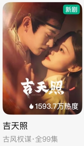 2月8日,由欢娱影视旗下短剧厂牌娱丸影视打造的古装爱情短剧《吉天照》正式上线红果短剧平台。该剧讲述了被欺压残害的梅萍重生而归,以一己之力,步步为营,捉蛀虫、打豪强,凭借自己的机智与努力冲破牢笼,一路翻盘逆袭重获新生的故事。《吉天照》自开播以来,迅速吸引了大量观众的目光,在红果短剧平台上取得了1500万+的热度。