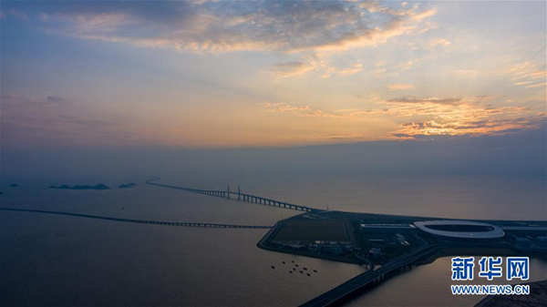 晨曦中的港珠澳大桥珠澳口岸人工岛(10月24日无人机拍摄)。新华社记者 张金加 摄