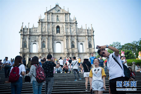 10月8日,人们在澳门大三巴牌坊前游览。新华社记者 张金加 摄