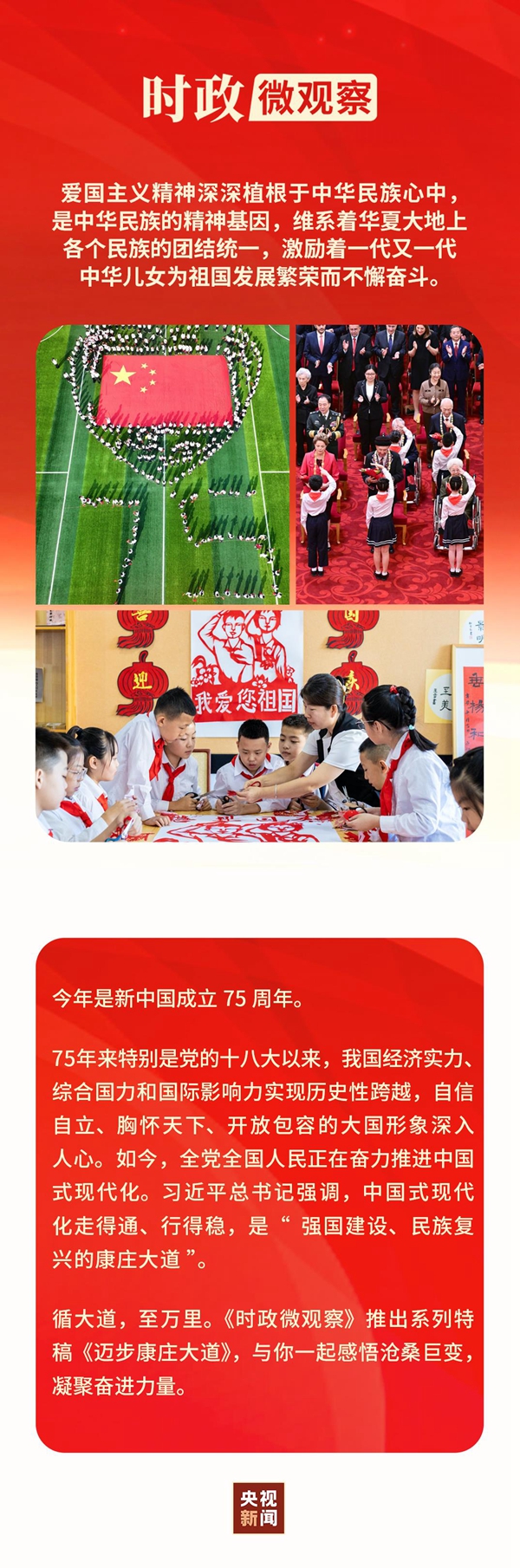 实现中华民族伟大复兴的中国梦,是当代中国爱国主义的鲜明主题。新征程上,我们要凝聚起心中的爱国情、强国志,勠力同心、开拓进取,共同谱写人民共和国更加绚丽精彩的新篇章。