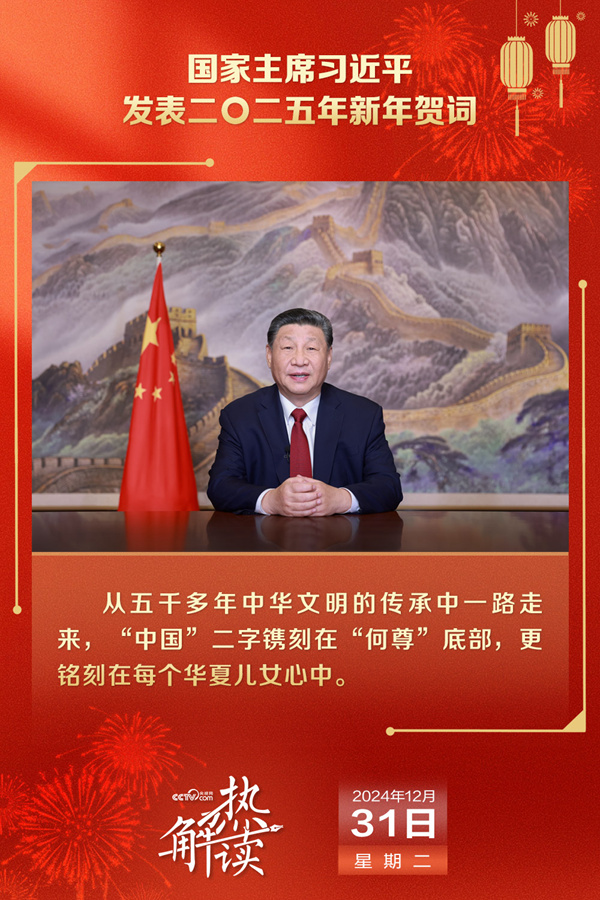 透过习近平主席二〇二五年新年贺词,我们可以从来之不易的年度“成绩单”中,读懂更为完善的制度保证、更为坚实的物质基础、更为主动的精神力量……深刻理解不断把国家发展、民族进步、人民幸福推向崭新高度的今日中国。