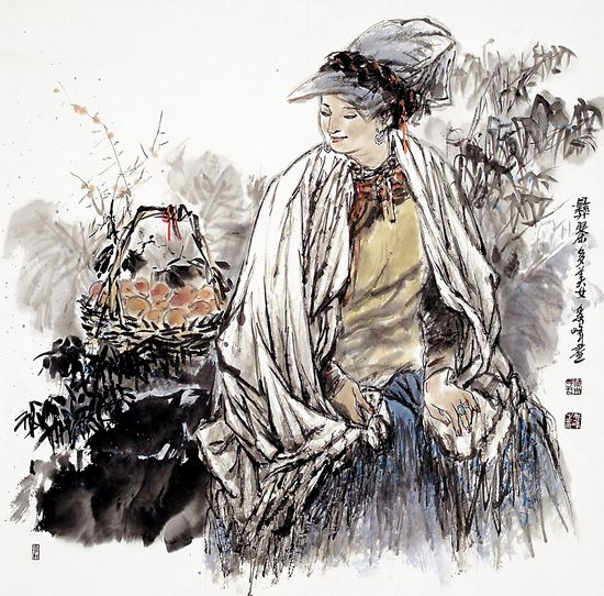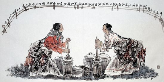 作为写意中国画家,李秀峰严格把握着分寸感,她不作过于夸张的变形,也不盲目风格化,而是在强调写实的前提下,删繁就简,适应调整,使作品在简练中见出丰富、单纯中见出娴熟、平凡中见出诗性;画家笔下的老人、青年、阿妈、少女、儿童等,都符合视觉规律,被表现得形神俱足、意趣盎然;由于画家熟知对象,更注重情感的传达,所以,在寥寥数笔中,在干湿浓淡的变化与演绎中,她使笔墨情感化,承载着生命内容的丰富,在挥洒中,既体现藏族人民生活风情的欢乐、洒脱与阳刚气息,又体现出水墨画的独特美感与意趣。