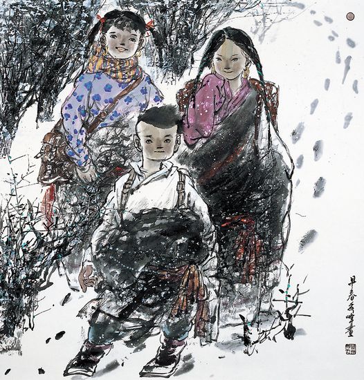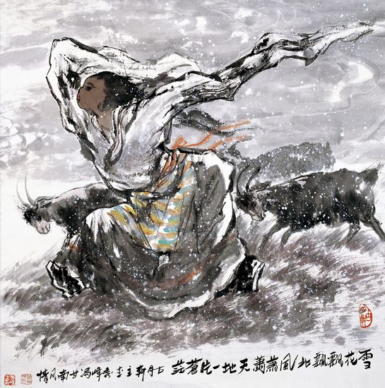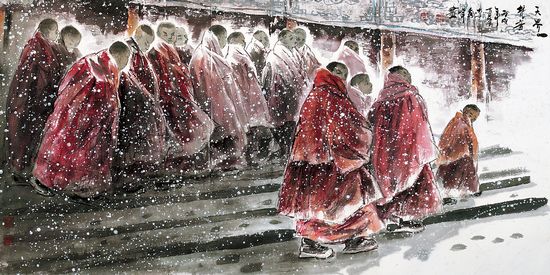 赏李秀峰的画,总会感觉到画意中流露出的声音,那是一种天籁。无论是浑然大气的营构、细腻工致的刻画、酣畅淋漓的挥洒,都会有一种声音自然流露。那种流露不只是意韵的悠远,不只是神采的飞扬,也不只是人物的传神,更是一种天籁——雪花飘落的声音,梵音远播的声音,草长的声音,花开的声音,牦牛随意的哞哞声,孩子欢快的笑声……李秀峰业已确立了自己具有浓厚西部地域性和鲜明时代感的艺术风格。