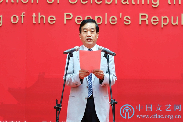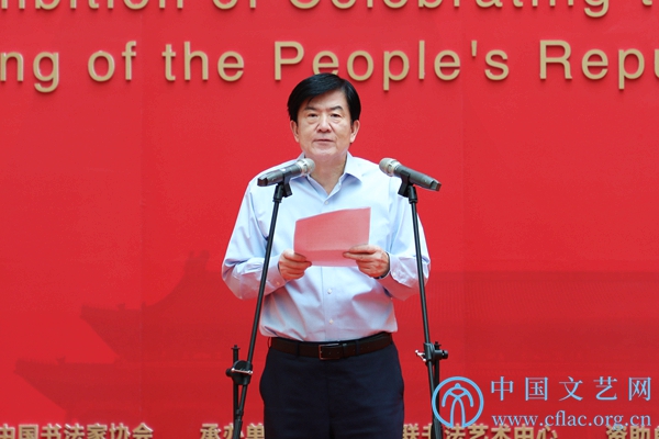 9月25日,“盛世中国——庆祝中华人民共和国成立70周年书法大展”开幕式在中国人民革命军事博物馆举行。图为中国书协分党组书记、驻会副主席陈洪武主持开幕式。中国文艺网 张钰童 摄