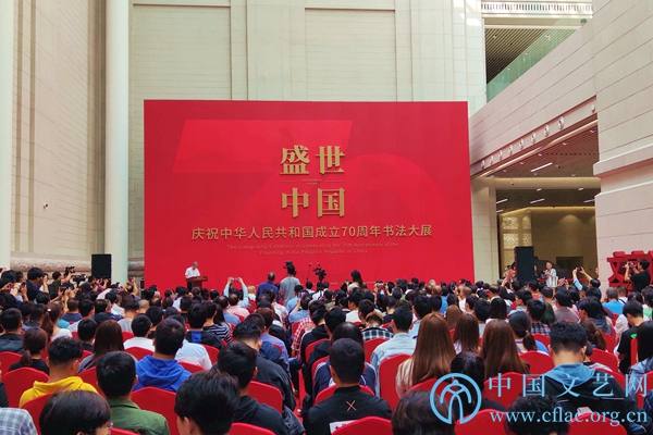 9月25日,“盛世中国——庆祝中华人民共和国成立70周年书法大展”开幕式在中国人民革命军事博物馆举行。图为开幕式现场。中国文艺网 张钰童 摄