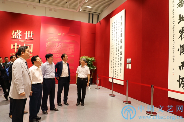 9月25日,“盛世中国——庆祝中华人民共和国成立70周年书法大展”开幕式在中国人民革命军事博物馆举行。图为第十一届全国政协副主席、中国文联名誉主席孙家正,中国文联党组书记、副主席李屹,中国文联党组成员、副主席李前光、陈建文,中国文联党组成员、书记处书记董耀鹏,中国书协主席苏士澍,中国文联副主席、中国书协副主席陈振濂,中国书协分党组书记、驻会副主席陈洪武等出席开幕式并参观展览。中国文艺网 张钰童 摄